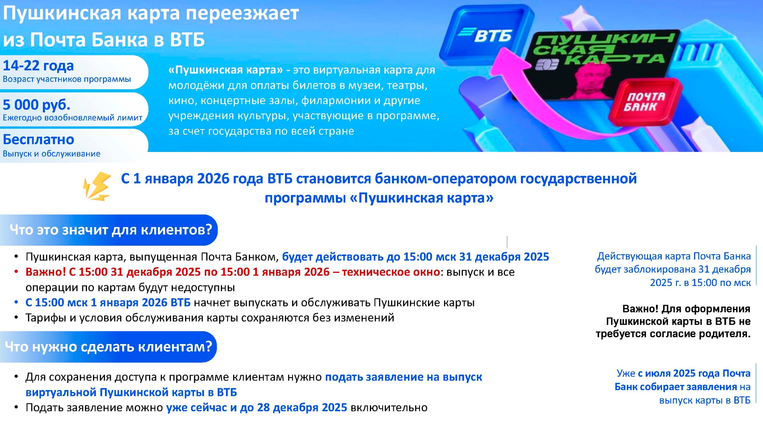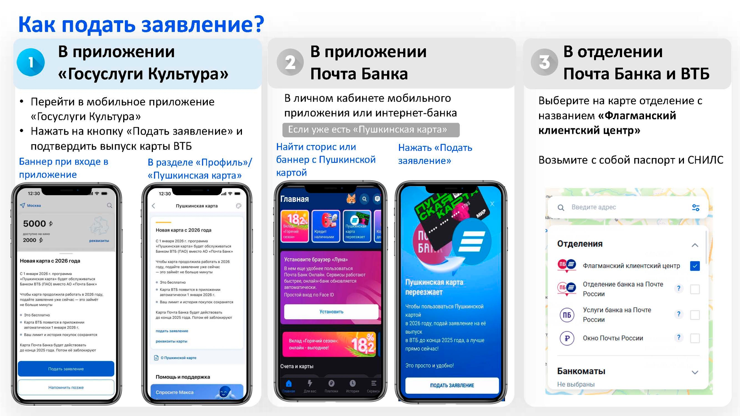 С 1 января 2026 года электронную карту можно будет оформить в приложении «Госуслуги Культура», в «ВТБ онлайн» (если пользователь уже является клиентом банка). Пластиковые карты будут доступны для получения в офисах ВТБ с 12 января 2026 года.